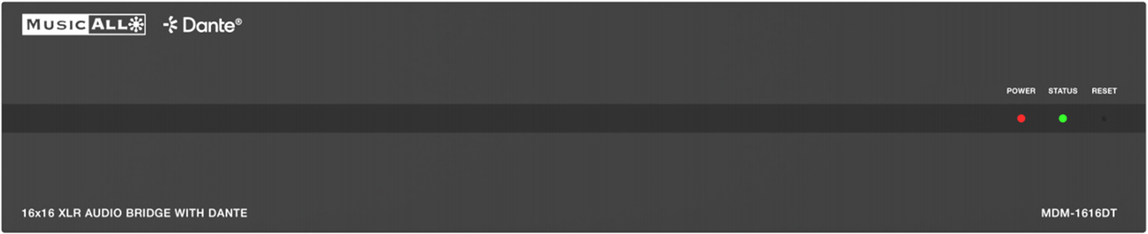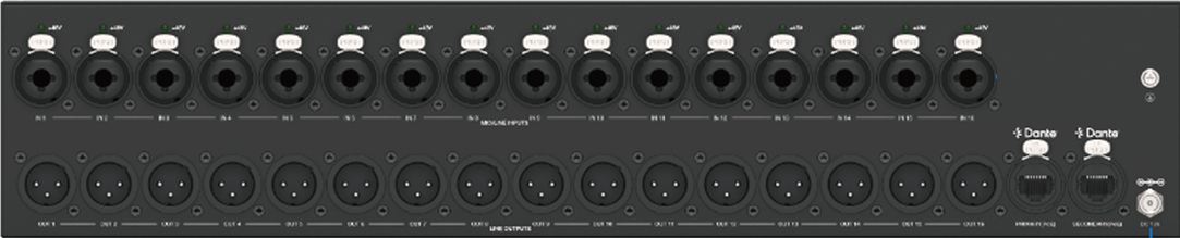 Dante® IO interface with DSP, 16×16 analog IO XLR Combi / 16×16 Dante® IO, mic/line level inputs, application and rackmounts included. PoE+