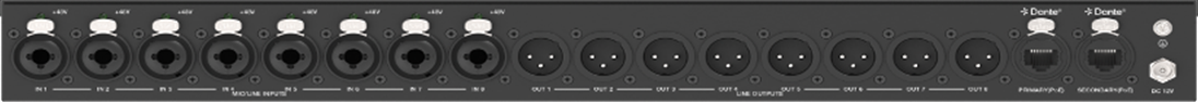 Dante® IO interface with DSP, 8×8 analog IO XLR Combi / 8×8 Dante® IO, mic/line level inputs, application and rackmounts included. PoE+